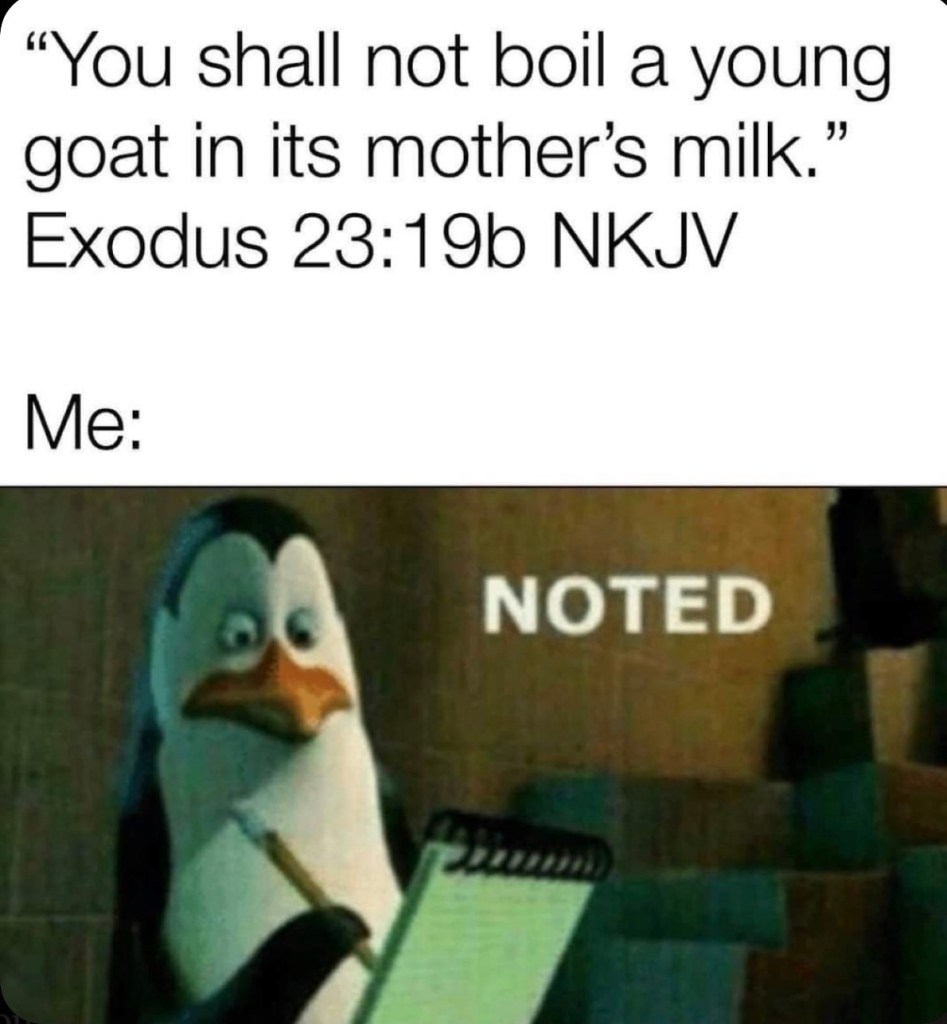—but take the words, “you shall not boil a young goat in its mother’s mile” and look at them comparing to, “you can’t hold a child to its mothers sins.”